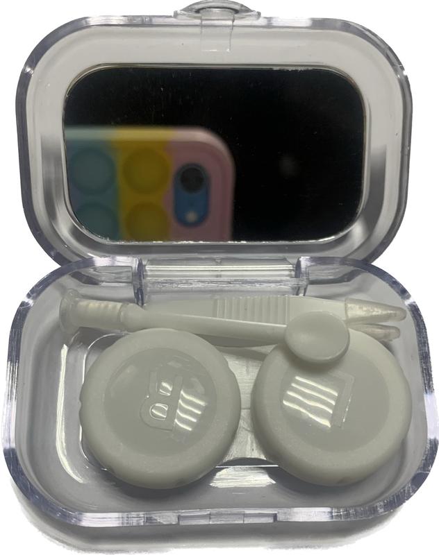 Футляр для линз eyes care. Малогабаритный герметичен имеет несколько модификаций расцветки и рисунков. Есть зеркало и комплект воспомогательных девайсов.