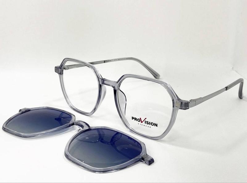 Жіноча напівпрозора багатокутна оправа з кліпоном матеріал оправи: ацетат целлози, нержавіюча сталь; стать: жіноча; на середнє обличчя; колір оправи: напівпрозорий сірий, чорний; колір лінзи кліпона: блакино-сірий, чорний. Заміри: 51*19-143. Загальна ширина 139 мм, висота 50 мм, між дужками 137 мм. Працюємо як інтернет-магазин зі своєю оптик-майстернею. Якщо Вам сподобалася дана модель оправи, можемо встановити лінзи за Вашим рецептом будь-якої складності, за бажанням пофарбуємо затонуємо лінзи в будь-який колір. Виготовимо окуляри за Вашим рецептом будь-якої складності: астигматичні лінзи; асферичні лінзи; лінзи з акомодацією; прогресивні лінзи; лентикулярні лінзи; біфокальні лінзи; антивідблискові лінзи; лінзи із комп'ютерним захистом; сонцезахисні окуляри з діоптріями; водійські окуляри з діоптріями; тонування та фарбування в один або кілька кольорів. Звертайтесь, завжди раді допомогти