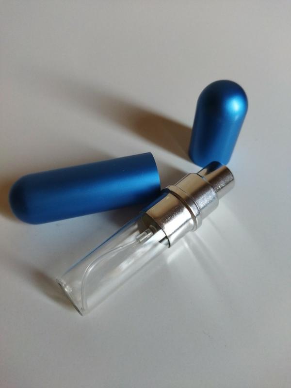 контейнер розпилювач для парфюма , метал тонкий, колба скляна, хоботок пластик, дуже зручна річ!!! загальна довжина 8 см тобто трохи довше ніж помада