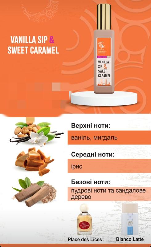 Пробник духов VANILLA SIP & SWEET СARAMEL BY FANTASY COMMUNITY PERFUMES. Верхние ноты: Ваниль, Миндаль Средние ноты: Тоффи Базовые ноты: Пудровые ноты и Сандал Семейство ароматов: Восточный гурманский Количество в упаковке - 1 шт Год премьеры парфюма - 2024 Страна производитель - США Страна регистрации бренда - США Объем - 2 мл. Погрузитесь в непревзойденную сладость аромата Vanilla Sip & Sweet Caramel от Fantasy Community Perfumes, который окутывает вас бархатным наслаждением гурманского удовольствия. Идеально подходит для тех, кто любит наслаждаться жизнью, этот аромат сочетает кремовую теплоту и деликатные пряности, создавая роскошный и уютный чувственный опыт. Аромат открывается непревзойденной комбинацией мягкой ванили и ореховой соблазнительности миндаля, мгновенно захватывающей чувства. В сердце аромата раскрывается сладкая нота ириса в карамели - насыщенная, сладкая, невероятно аппетитная. Наконец, аромат оседает в нежном пудровом шлейфе, где сандаловое дерево добавляет глубины и элегантности, оставляя мягкий след на коже. Vanilla Sip & Sweet Caramel — идеальный спутник для прохладных осенних и зимних вечеров, отлично подходит для интимных моментов, уютных вечеров или для отдыха с максимальным комфортом. Прекрасный выбор как для женщин, так и для мужчин, которые ценят наслаждение жизнью. Категория: Для женщин, Для мужчин Формат - Тестер. Класс парфюма - Нишевые Тип - Extrait de Perfume