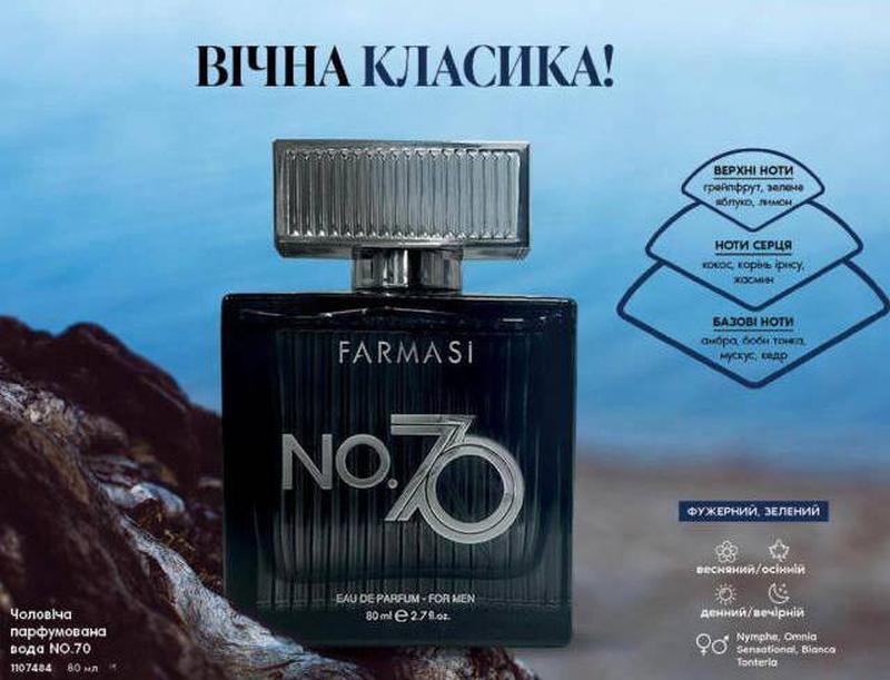 Цена в синтезе всего 5️⃣0️⃣9️| грн Деревний аромат. Начальная нота: лимон, грейпфрут, зеленое яблоко. Ноты: сердце: кокос, корень ириса, кедр. Конечная нота: амбра, мускус. Мужская парфюмерная вода Farmasi No. 70 80 мл – это воплощение силы и уверенности в себе. Известный аромат наполняет владельца провокационным и благородным шиком, делая его неповторимым и привлекательным.