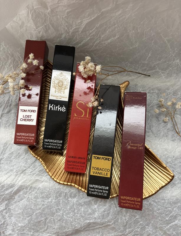 Набір з 5 ароматів у форматі 10 мл. ✨ Tiziana Terenzi Kirke Соковитий, магнітний аромат з нотами персика, маракуї та чорної смородини. Спокуса, загорнута в фруктовий шлейф, який залишає слід навіть після того, як ти пішла. 🍒 Tom Ford Lost Cherry Вишнева насолода з мигдалем і ваніллю. Солодкий, грайливий і злегка провокативний аромат для впевнених у собі. 💎 Maison Francis Kurkdjian Baccarat Rouge 540 Extrait Розкіш у кожній краплі — кристальна амбра, жасмин і шафран створюють відчуття оксамитової елегантності. Аромат, який чутно навіть у тиші. 🌿 Tom Ford Tobacco Vanille Теплий, густий і глибокий аромат із поєднанням тютюну, ванілі та спецій. Він пахне розкішшю, затишком і впевненістю. Ідеальний для вечора, коли хочеться залишити по собі спокусливий шлейф. ❤️ Giorgio Armani Si Passione Жіночний, пристрасний і енергійний. Чорна смородина, троянда й ваніль створюють аромат справжньої впевненості й ніжності водночас. Це «так» любові до життя, до себе і до своїх бажань.