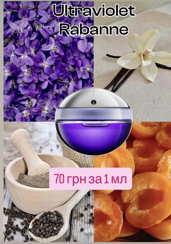 Прем’єра аромату: 1999 Бренд: Rabanne Серія: Ultraviolet Група товару: Парфумована вода Країна ТМ: Іспанія Парфумер: Jacques Cavallier Зроблено в: Іспанія, Франція Стать: Для жінок Класифікація: Елітна Тип аромату: Амброві, Квіткові Початкова нота: Абрикос, Коріандр, Мигдаль, Перець, Трояндове дерево, Червоний перець Нота серця: Жасмин, Османтус, Троянда, Фіалка Кінцева нота: Амбра, Ваніль, Кедр, Пачулі Застереження: Зберігати у недоступному для дітей місці, Легкозаймисте, Не використовуйте поблизу відкритого вогню чи джерел тепла, Уникати потрапляння в очі