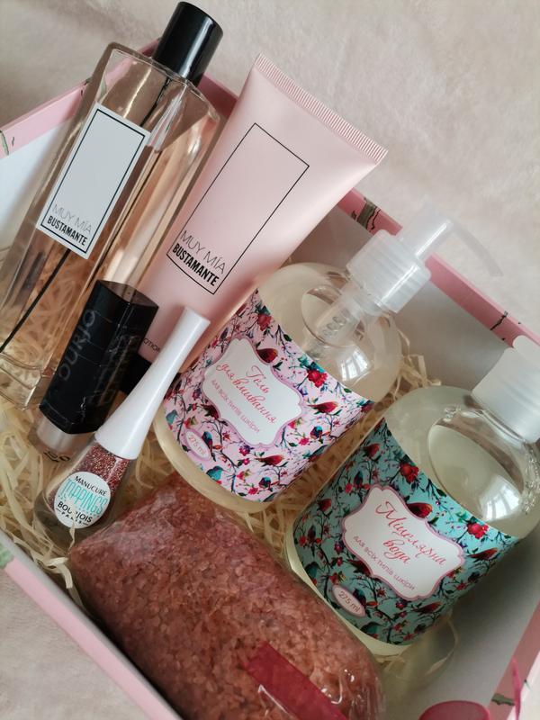 Содержимое бокса: ❤️Духи ❤️Ароматизированый лосьон ❤️Помада ❤️Топ для лака ❤️Соль для ванны ❤️Гель для умывания лица ❤️Мицелярная вода ❤️Авторское оформление
