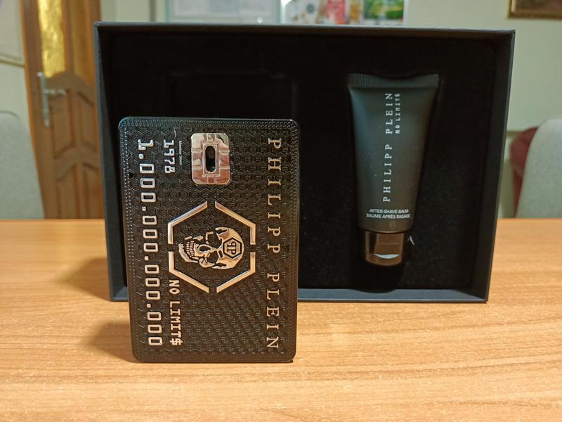 Philipp Plein No Limit$ Трудно определить остаток, поскольку флакон не просвечивается. По ощущениям без 4-5 мл. Весь набор стоит 1800 грн (парф.вода 50 мл+бальзам после бритья 50 мл).