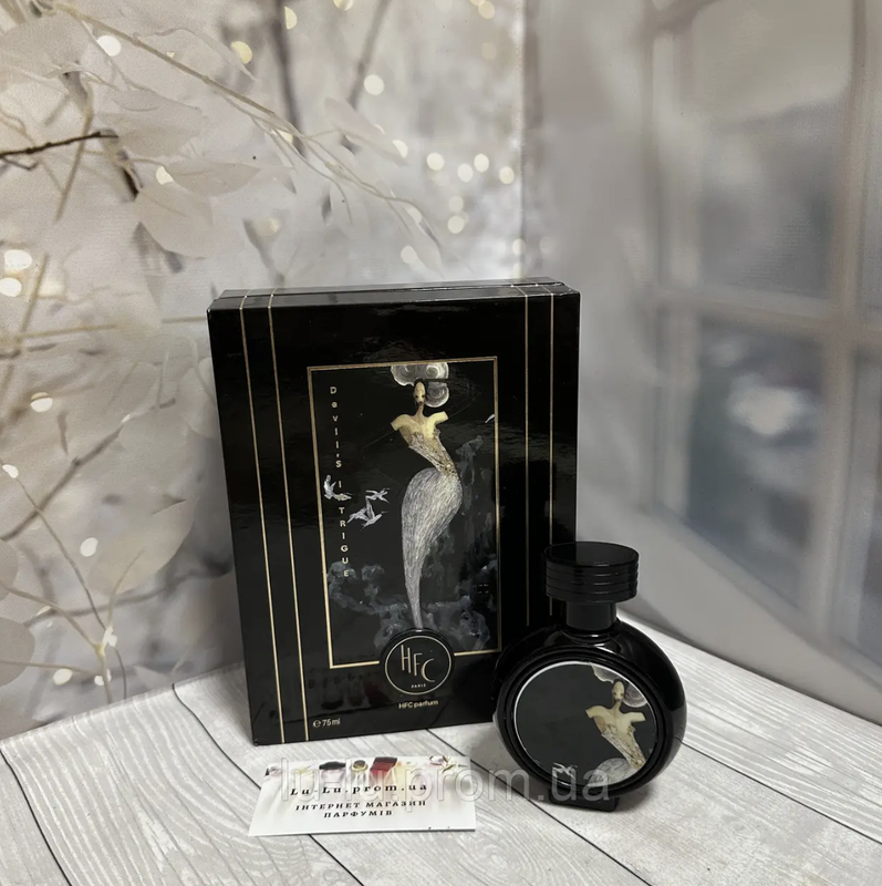 Haute Fragrance Company Devil's Intrigue (Фрагранс Компани Интриги Дьявола ,Девилс Интриг) Прем’єра аромату: 2018 Об'єм: 75ml Стать: для жінок Класифікація: нішева Тип аромату: деревинні, квіткові, мускусні Початкова нота: Білий чай, Османтус Нота серця: Квітка апельсина, Сандал Кінцева нота: Ваніль, Деревинні ноти, Кашмеран