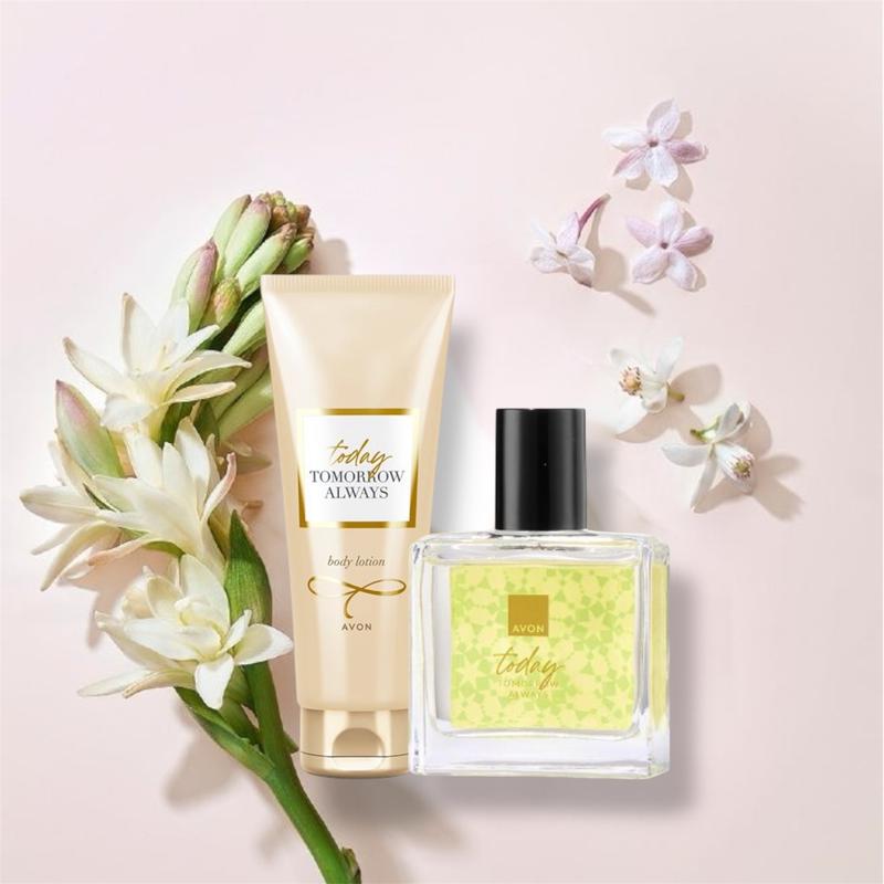 Розкішний жіночий набір Парфумна вода Today 30 мо Парфумований лосьйон для тіла Today | 125 мл | Today. Tomorrow. Always ПАРФУМЕРЕНЬ БРЕНД No1 В AVON Тип аромату: квітковий Ноти: • верхні ноти: біла фрезія, кактус, неролі • ноти серця: гібіскус, ваточник сирійський, апельсиновий колір • шлейф: мускус, кедр, сандал Країна виробник Польща
