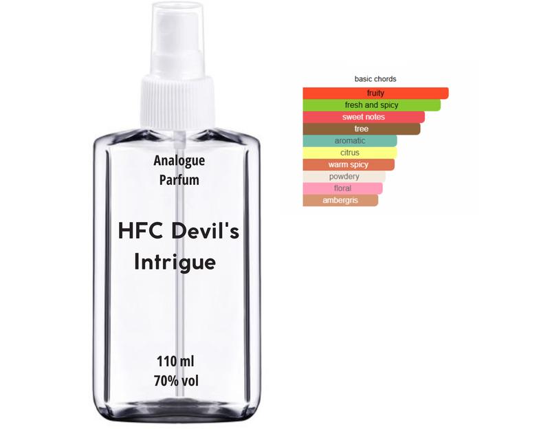 Духи (аромат HFC Devil's Intrigue) 110 мл Пол: для женщин Классификация: нишевая Тип аромата: мускусные, деревянные, цветочные. Начальная нота: Белый чай, Османтус Нота сердца: Цветок апельсина, Сандал. Конечная нота: Ваниль, Древесные ноты, Кашмеран