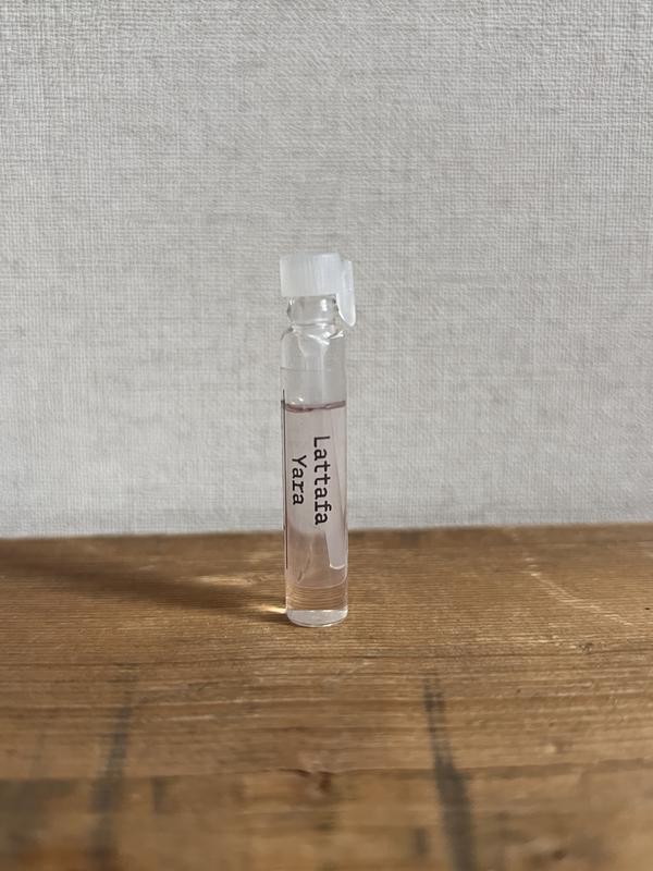 Lataffa Yara віолка 1,8 мл, було декілька затестів, залишок на фото приблизно 1,6 мл Парфум для жінок, належить до групи ароматів Східні Ванільні. Yara був випущений в 2020. Верхні ноти: Орхідея, Геліотроп і Тангерин; ноти серця: Гурманський акорд і Тропічні Фрукти; ноти бази: Ваніль, Мускус і Сандал.