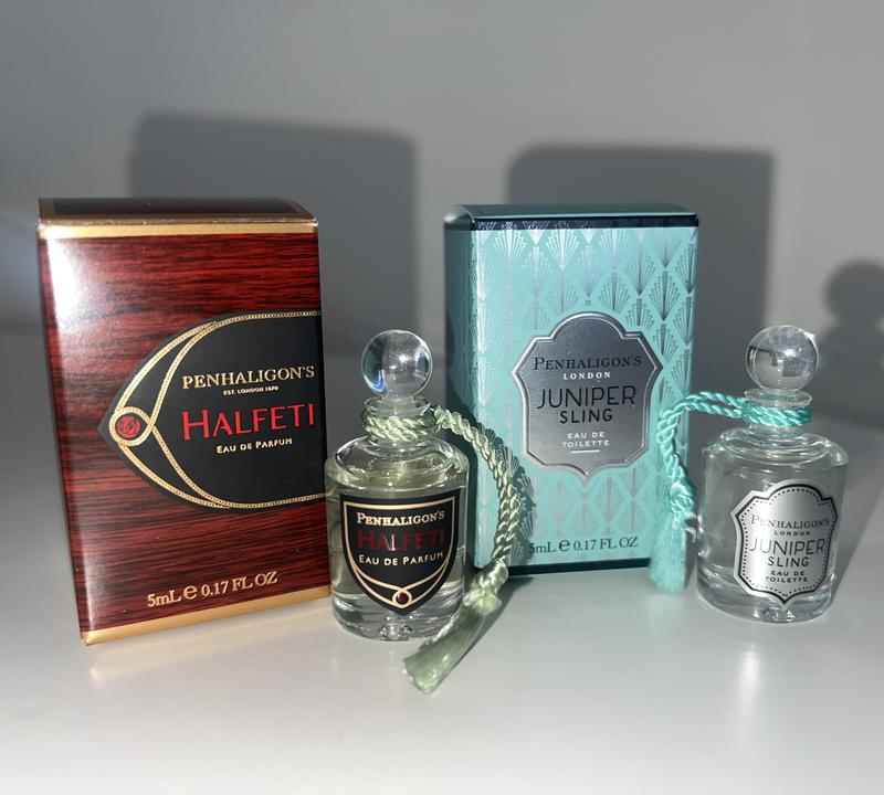 1. Penhaligon's Trade Routes Halfeti Eau De Parfum(5 ml) - східний деревний аромат для чоловіків і жінок. Опис: східний, деревний. Ноти: амбра, бергамот, боби тонка, ваніль, грейпфрут, жасмин, кардамон, кедр, кипарис, шкіра, мускус, полин гіркий (артемізія), троянда болгарська, сандал, шафран, мускатний горіх, агарове дерево 2. Penhaligon's Juniper Sling Eau De Toilette(5 ml) - пряний деревний аромат для чоловіків і жінок. Опис: деревний, пряний, мускусний, свіжий. Ноти: ангеліка (дягиль), апельсин, ветивер, вишня, кардамон, шкіра, корінь ірису, кориця, перець, цукор, ягоди ялівцю 1. Продано 2. Ціна - 600 грн