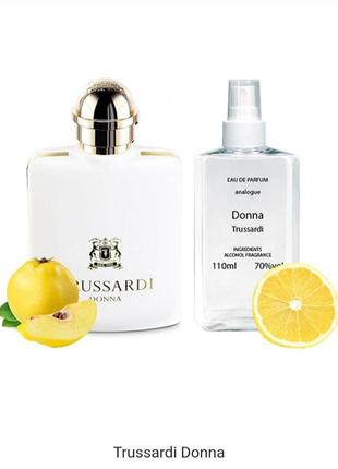 Donna Trussardi Легкий, немов фруктовий десерт, аромат зустрічає фруктовим акордом, що іскристим, утвореним терпкими нотами соковитого юзу і цитрона, просоченого морським повітрям. Далі входять білі квіти апельсина, ноти жасминового чаю, а шлейфі відчувається тонке звучання ніжного лотоса.Об'єм 110 мл.