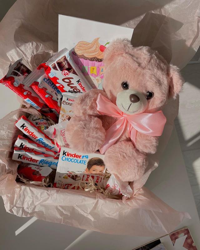 Состав подарка 💗🐻 ☁️ невероятный мишка игрушка ☁️открытка ☁️kinder max ☁️киндер сюрприз ☁️киндер bueno ☁️kinder chocolate ☁️kinder злаки ☁️kinder delice ☁️raffaello ☁️kinder mini bueno ☁️подарункова упаковка