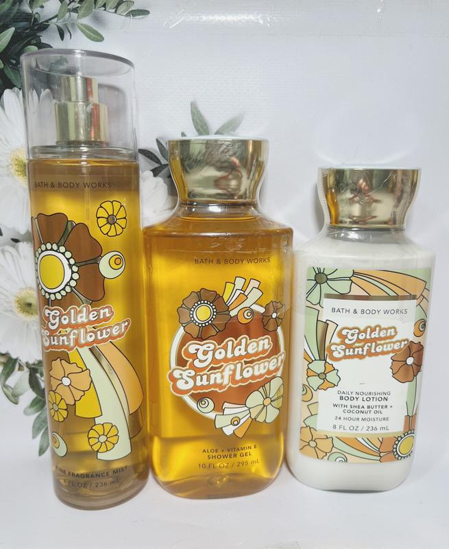 🌺Набор мист + лосьон для тела и гель для душа Golden sunflower от Bath and body works 🌸 Парфюмированный спрей (мист) для тела Bath and Body Works - Golden sunflower 💖 Парфюмированный спрей для тела с экстрактом алоэ питать кожу, создавая легкий и освежающий аромат. ✅Объем: 236 мл 🌸 Лосьон для тела Bath and Body Works - Golden sunflower 💖 Деликатная текстура лосьога для тела с маслом ши, кокосовым маслом и витамином Е буквально тает на коже и увлажняет ее в течение 24 часов. Придает коже мягкость, гладкость и прекрасный аромат ✅Объем: 236 мл 🌸 Гель для душа с маслом ши, алоэ и витамином Е - Golden sunflower от Bath and body works. 💖 Гель для душа с питательным витамином Е в сочетании с маслом ши бережно очищает кожу и одновременно питает и увлажняет ее, имеет насыщенный аромат и густую консистенцию, что дает супер экономный расход, достаточно маленькой капельки, чтобы полноценно намылить большую банную мочалку. ✅Объем: 295 мл 💦 Композиция аромата: сияющая смесь лепестков подсолнечника, цветка апельсина и свежей ванили