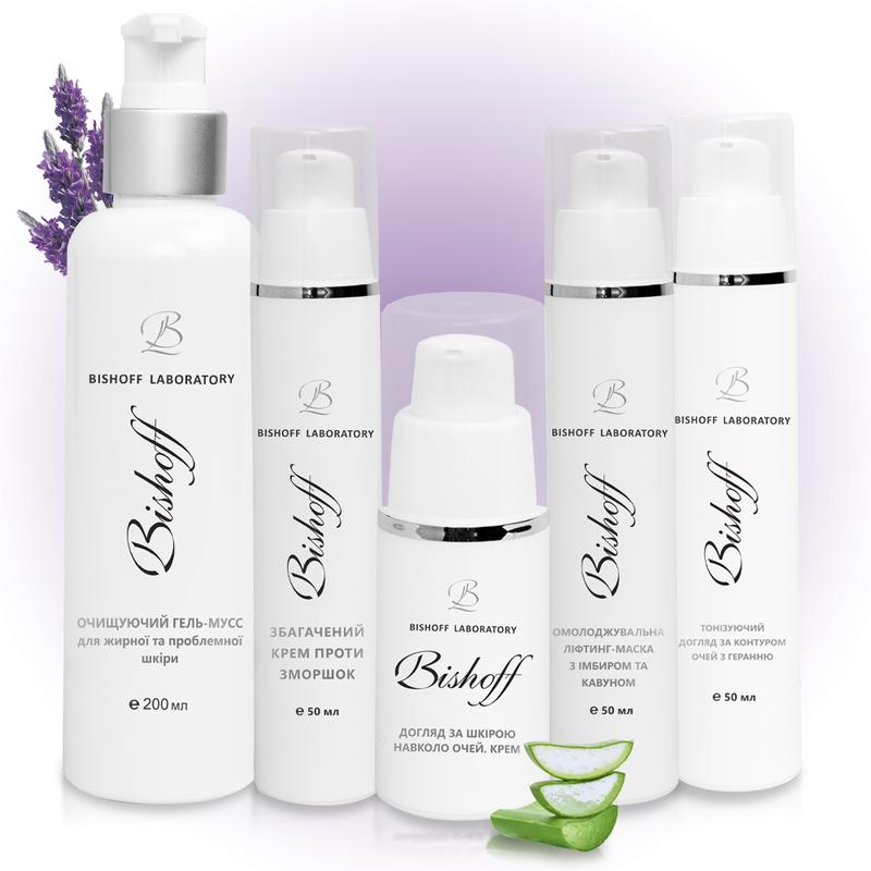 Набір для комплексного омолодження жирної шкіри обличчя. Набір на 2 місяці відповідно включає: 1. Очищуючий гель-мусс для жирної та проблемної шкіри з вереском 200мл 2. Збагачений крем проти зморшок 50мл 3. Омолоджуюча ліфтинг-маска з імбиром та кавуном 50мл 4. Тонізуючий догляд за контуром очей з геранню 50 мл 5. Догляд за шкірою навколо очей. Крем 15 мл Набір створений спеціально для вирішення проблем та омолодження жирної шкіри. Три засоби для обличчя глибоко зволожують епідерміс, загоюють запалення, очищують та стягують пори, матують та регулюють виділення себуму. Два засоби для очей чудово тонізують та відновлюють шкіру у відповідній зоні. Продукти регенерують клітини шкіри, швидко вирівнюють рельєф обличчя, усуваючи зморшки та дрібні пігментні плями. Спосіб застосування: Мус – спінити продукт у долонях, массажними рухами нанести на вологу шкіру обличчя і шиї, змити прохолодною водою і нанести тонік. Тонік для зони навколо очей – нанести кілька крапель засобу на шкіру біля очей, рознести засіб чистими руками на всю зону. Крем – масажними рухами нанести на шкіру обличчя та шиї або на зону навколо очей. Маска – нанести на очищену тонізовану шкіру обличчя, залишити на 20-30 хвилин, змити водою кімнатної температури, нанести крем. Використовувати 2-3 рази на тиждень. Склад: 1. Очищуючий гель-мусс для жирної та проблемної шкіри з вереском Вода дистильована, лаурил глюкозид, кокобетаін, екстракт вересу, кислота саліцилова, активний комплекс (природний полімінерал бішофіт + полісахариди гриба шиітаке), амігель, ефірна олія м'яти, трилон Б, бензоат натрію. 2. Збагачений крем проти зморшок Вода дистильована, активний комплекс (природний поліменірал бішофіт + полісахариди гриба шиітаке), екстракт фіалки, екстракт лофанта, екстракт софори, вітамінний комплекс А, E, D, мигдальна олія, олія квітів апельсину, олія сандалового дерева. 3. Омолоджуюча ліфтинг-маска з імбиром та кавуном Вода дистильована, екстракт кигелії, екстракт кореню імбиру, екстракт кореню топінамбура, екстракт кореню солодки, активний комплекс (природний полімінерал бішофіт + полісахариди гриба шиітаке), екстракт орхідеї, олія насіння кавуну, емульгатор, ксантанова камідь, ефірна олія імбиру, бензоат натрію, трилон Б. 4. Тонізуючий догляд за контуром очей з геранню Вода дистильована, екстракт герані, екстракт ладану, екстракт гамамелісу, активний комплекс (природний полімінерал бішофіт + полісахариди гриба шиітаке), бензоат натрію. 5. Догляд за шкірою навколо очей. Крем Вода дистильована, олія макадамії, екстракт алое, екстракт волошки, вітамінний комплекс А, Е, D, Regu-age (протеїни сої і чорного рису), амігель, активний комплекс (природний полімінерал бішофіт + полісахариди гриба шиітаке), емульгатор, ефірну олія петітгрейну, бензоат натрію, ЕДТА.