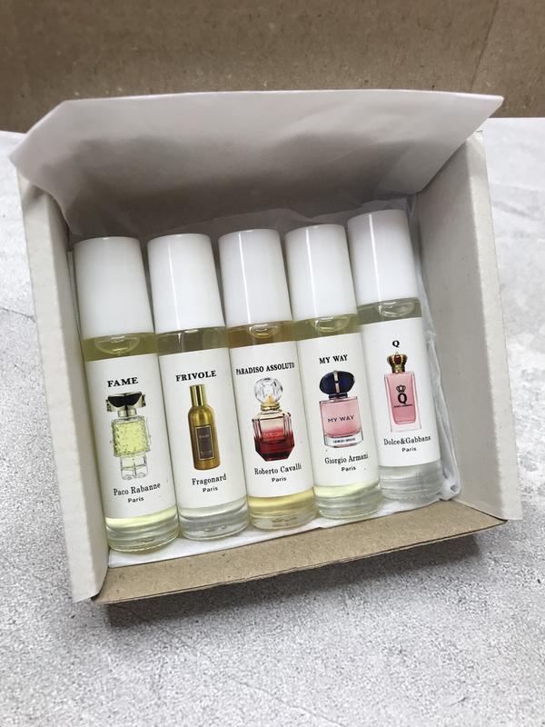 Набір масляних парфумів з 5 ароматів по 10 мл.В набір входять: Paco Rabanne Fame 10ml. Fragonard Frivole 10ml. Roberto Cavalli Paradiso Assoluto 10ml. Giorgio Armani My Way 10ml. Dolce & Gabbana Q 10ml.