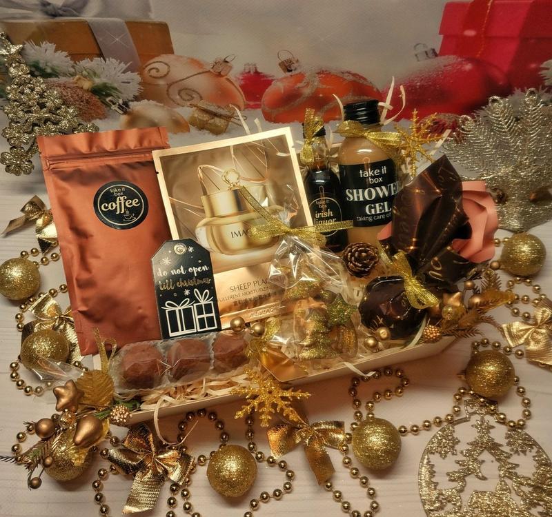 1. Подарочная коробка с наполнителем и лентой 2. Кофе 3. Сироп "Irish liquor" 50ml 4. Тканинна маска для обличчя 5. Гель для душу 6. Сахарный скраб для тела 7. Куля для ванни 8. Новогоднее мыло 9. Открытка В нашем интернет магазине большой ассортимент уникальных подарочных боксов ручной работы - Оригинальные и полезные подарки - Корпоративные подарки - Подарочные боксы на День Рождения - Боксы для мужчин - Новогодние боксы - Секретный Санта - Бокси до дня Св. Валентина - Боксы на 8 марта - Индивидуальные подарочные боксы - Широкий асортимент - Приятные цены - Индивидуальный подход к каждому клиенту, учтем все ваши пожелания - Сбор и отправка в кратчайший срок - Доставка по всей территории Украины (Новая Почта, УкрПочта, Justin)