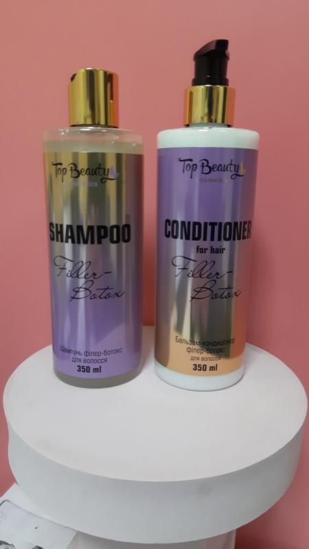 Шампунь филлер-ботокс для мытья волос, создает эффект ламинации. Основой которого являются мягкие моющие составляющие. Они бережно очищают кожу головы и волосы и при этом не сушат и не вызывают раздражений. Активными компонентами шампуня являются: Гидролизат протеинов шелка – которые удерживают влагу, предупреждая появление секущихся кончиков, а также ломкость и ослабление волос. Коллаген – способствует утолщению и уплотнению волос по всей длине, их шелковистости и зеркальному блеску. Витамин Д-пантенол – придает волосам здоровый блеск и эффект шелка без утяжеления. Кондиционер филлер-ботокс для волос оказывает эффект ламинации, разглаживая и питая волосы. В его состав входят активные компоненты, которые делают локоны шелковистыми и мягкими на ощупь: Молочная кислота – создает необходимый уровень кислотности для достижения неперевернутой гладкости волос. Помимо этого эта кислота восстанавливает силу волос, разглаживает их поверхность, придает блеск и шелковистость. Экстракт крапивы - благодаря витаминам и микроэлементам, содержащимся в его составе, насыщает волосы питательными веществами и влагой. Гидролизат протеинов кератина – это основной компонент, отвечающий за структуру волос, восстанавливая клетки и улучшая состояние локонов.