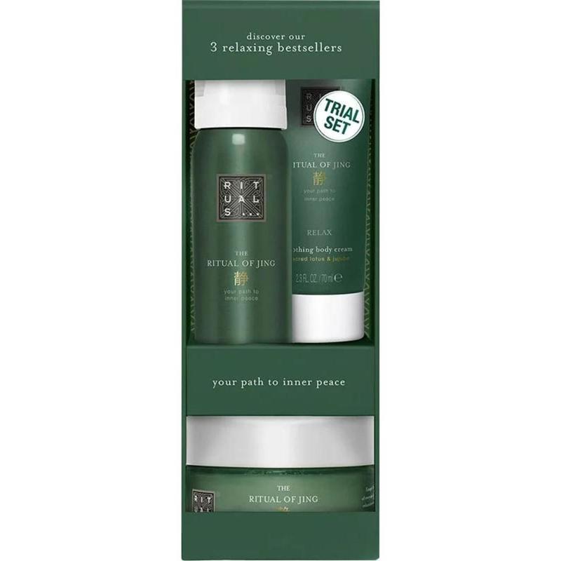Подарочный набор The Ritual Of Jing Trial Set Подарочный набор The Ritual Of Jing Trial Set -- уходовые средства для проведения ритуалов красоты, которые создадут атмосферу гармонии и ароматики зизифуса, лаванды и белого лотоса. Каждый продукт состоит из натуральных компонентов, которые благоприятно влияют на общее состояние и качество кожи, обогащая ее полезными экстрактами и микроэлементами. Бьюти-комплект включает в себя три основных средства для скрабирования, очищения и смягчения кожного покрова. Скраб для тела The Ritual of Jing Rituals мягко отшелушивает омертвевшие частички кожи, деликатно очищая и выравнивая поверхность кожи. Скраб стимулирует микроциркуляцию и регенеративные способности кожного покрова, придает ему здоровый и равномерный цвет. Скрабирование разглаживает поверхность кожи и придает ей бархатистость. Гель-пенка для очищения устраняет излишки грязи и себума на поверхности кожи, не вызывая ощущения стянутости и сухости. Средство для очищения не нарушает кислотно-щелочной и водный баланс кожи, успокаивает покраснения и воспаления. Крем для кожи служит закрепляющим средством для эффекта от очищающих продуктов. Крем сохраняет свежесть кожи и не оставляет ощущения пленки. Оптимальная консистенция легко распределяется и быстро впитывается, делая кожу напитанной и увлажненной. Комплексный уход за кожей тела The Ritual of Sakura Rituals улучшает качество кожи, разглаживает и увлажняет ее поверхность, оставляя легкий и приятный аромат цветочной композиции. В составе набора: Гель-пена The Ritual of Jing Rituals 50 мл, скраб для тела The Ritual of Jing Rituals 125 мл, крем для тела The Ritual of Jing Rituals 70 мл. Преимущества набора The Ritual of Jing: - Скраб тщательно устраняет ороговевшие частички кожи - Стимулирует регенерацию клеток, улучшает кровообращение и лимфодренаж - Повышает тонус, упругость и эластичность кожи - Обеспечивает тщательное очищение поверхности кожи от загрязнений, без нарушения липидного баланса - Выравнивает рельеф кожи - Бережное очищение без чувства стянутости и сухости - Устраняет шелушения и успокаивает воспаления - Обеспечивает тонизирующее и заживляющее действие - Крем интенсивно увлажняет кожный покров - Разглаживает и выравнивает тон кожи - 92% натуральных компонентов в составе - Каждое средство оставляет легкий аромат цветочной композиции - Подходит для любого типа кожи Способ применения: Гель-пенку распределить по влажной коже, вспенить и смыть. Скраб нанести на кожу массажными движениями и смыть. На чистую сухую кожу нанести крем до полного впитывания.