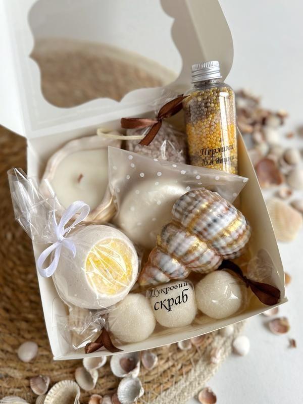 Подарунковий набір, в якому є все, щоб отримати насолоду від домашніх спа процедур. Тат ви знайдете пляшечку перлинок для ванни ( обʼєм 100 мл) на два використання. Перлинки містять корисні екстракти які помʼякшують воду і дбають про вашу шкіру. Велика бомбочка для ванни з білою глиною і морською сіллю наповнить ванну шиплячими бульбашками і надзвичайно гарно пахне аромат «Сіль спа». Мило ручної роботи у вигляді мушлі дбайливо очищує шкіру. Натуральна тверда піна для ванни з ефірними оліями подарує повну ванну пишноі піни і помʼякшить воду Ароматний цукровий скраб в кульках з олією мигдалю зробить вашу шкіру мʼякою та гладенькою. А свічка з соєвого воску у гіпсовому підсвічнику мушлі наповнить простір неймовірним морським ароматом і створить справжню розслаблюючу атмосферу. Мішечок з перламутровою морською сіллю зробить прийняття ванни корисним і красивим Додаткові характеристики: Стать: Жіночий Товар виготовляється на замовлення