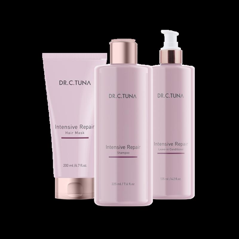 До набору входять: 1000885 Відновлювальний шампунь для волосся для інтенсивного догляду Intensive Repair Dr. C. Tuna, 225 мл Вже після перших його застосувань можна буде помітити, як пересушений, пошкоджений волосяний покрив стає міцнішим, привабливим візуально і стійким до зовнішніх негативних факторів. Активні компоненти глибоко проникають у структуру волосся, живлячи необхідними зволожувальними і відновлювальними компонентами. Завдяки своїй делікатній формулі шампунь дбайливо очищає пасма, не руйнуючи їхній природний захисний бар'єр. Вас потішить результат у вигляді доглянутого, сяючого здоров'ям і ароматного волосся. Інструкція із застосування Нанести на вологе вимите волосся, добре вспінити, залишити на 5 хвилин, після цього змити теплою водою. Склад Water/Aqua, Sodium C14-16 Olefin Sulfonate, Coco-Betaine, Glycerin, Hydrolyzed Vegetable Protein, Fragrance/Parfum, Polyquaternium-10, Phenoxyethanol, Styrene/Acrylates Copolymer, Ethylhexylglycerin, Citric Acid, Coco-Glucoside, Disodium EDTA, Sodium PCA, Sodium Lactate, Arginine, Aspartic Acid, PCA, Glycine, Alanine, Propylene Glycol, Serine, Valine, Lysine, Threonine, Proline, Isoleucine, Biof lavonoids, Histidine, Phenylalanine, Hydrolyzed Adansonia Digitata Extract, Dextrin, Linalool. 1000886 Відновлювальна маска для волосся для інтенсивного догляду Intensive Repair Dr. C. Tuna, 200 мл Для активного відновлення пошкодженого волосся експерти Farmasi розробили інноваційну маску. Її активні компоненти проникають глибоко в структуру пасм, інтенсивно зволожують, активно живлять і делікатно пом'якшують їх. Засіб регенерує пошкоджені локони, згладжує волосяні лусочки, дарує їм життєву силу та чудовий блиск. Засіб надійно захищає завитки від агресивного впливу чинників навколишнього середовища, дає змогу пофарбованим локонам зберегти інтенсивність кольору, полегшує процес розчісування. Маска вирізняється легким ароматом, який неодмінно сподобається шанувальниці вишуканих пахощів. Засіб подарує волоссю гладкість, шовковистість і еластичність. Інструкція із застосування Нанести на вологе волосся, рівномірно розподіливши за всією довжиною. Ретельно змити. Склад Water/Aqua, Cetearyl Alcohol, Behentrimonium Chloride, Cetrimonium Chloride, Bis-Diisopropanolamino-PG-Propyl Disiloxane/Bis-Vinyl Dimethicone Copolymer, Cetyl Alcohol, Glyceryl Stearate, Glycerin, Polyquaternium-37, Fragrance/Parfum, Hydrolyzed Vegetable Protein, Ceteareth-20, Ceteareth-12, Citric Acid, Potassium Sorbate, Mangifera Indica (Mango) Seed Butter, Cocos Nucifera (Coconut) Oil, Maltodextrin, Cetyl Palmitate, Brassica Campestris (Rapeseed) Seed Oil, Sodium PCA, Disodium EDTA, Sodium Lactate, Propylene Glycol, Arginine, Linum Usitatissimum (Linseed) Seed Oil, Emblica Officinalis Fruit Extract, Aspartic Acid, PCA, Biof lavonoids, Sodium Benzoate, Glycine, Alanine, Serine, Lysine, Valine, Threonine, Proline, Isoleucine, Nephelium Lappaceum Seed Extract, Hydrolyzed Adansonia Digitata Extract, Histidine, Phenylalanine, Dextrin, Linalool. 1000887 Відновлювальний незмиваэмий кондиціонер для волосся для інтенсивного догляду Intensive Repair Dr. C. Tuna, 125 мл Кондиціонер для інтенсивного відновлення пошкодженого волосся подарує локонам здоров'я, пружність, силу і легкість. Підійде як для професійного, так і для домашнього застосування. Продукт має регенерувальні властивості, пом'якшує і живить пасма, насичує їх корисними речовинами, а також дарує природний блиск. Регулярне використання такого помічника поверне волоссю життєву силу, енергію і зробить його слухняним. Відчуйте себе розкішною та доглянутою красунею із зволожувальним кондиціонером. Інструкція із застосування Не змивати. Після нанесення обережно висушіть волосся рушником, щоб видалити зайву воду після душу. Акуратно розчешіть волосся пальцями або гребінцем із широкими зубцями. Уникайте маківки. Дайте волоссю висохнути на повітрі або продовжуйте укладати, як зазвичай. Не для всіх типі