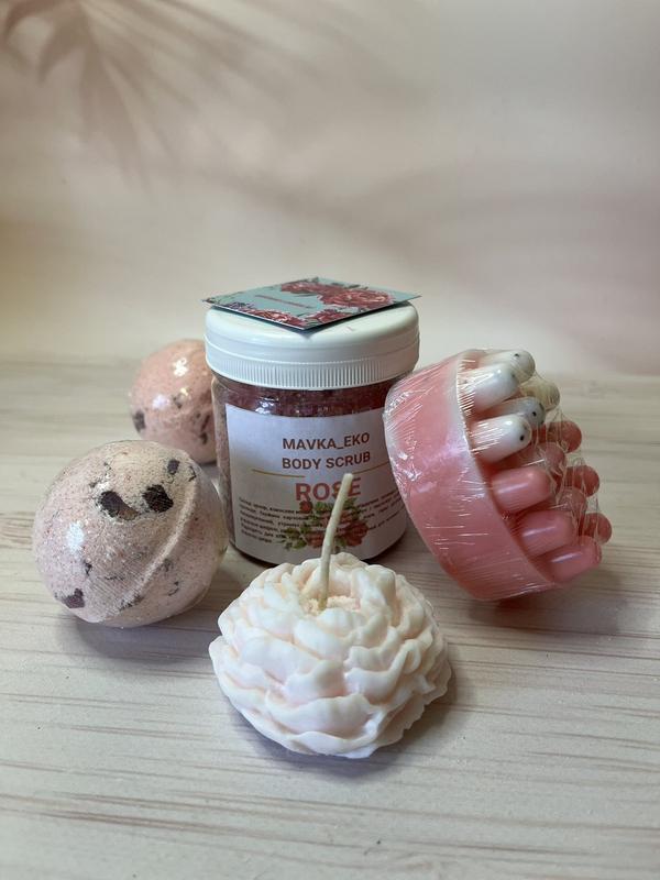 🌸Мыльный набор ручной работы, в который входит: -антицеллюлитное массажное мыло -сахарный скраб щу отдушкой роза, с добавлением лепестков розы -соевая свеча Пион -бомбочки для ванни 2шт 🎀Цена - 430грн. 💙Детали в приват.