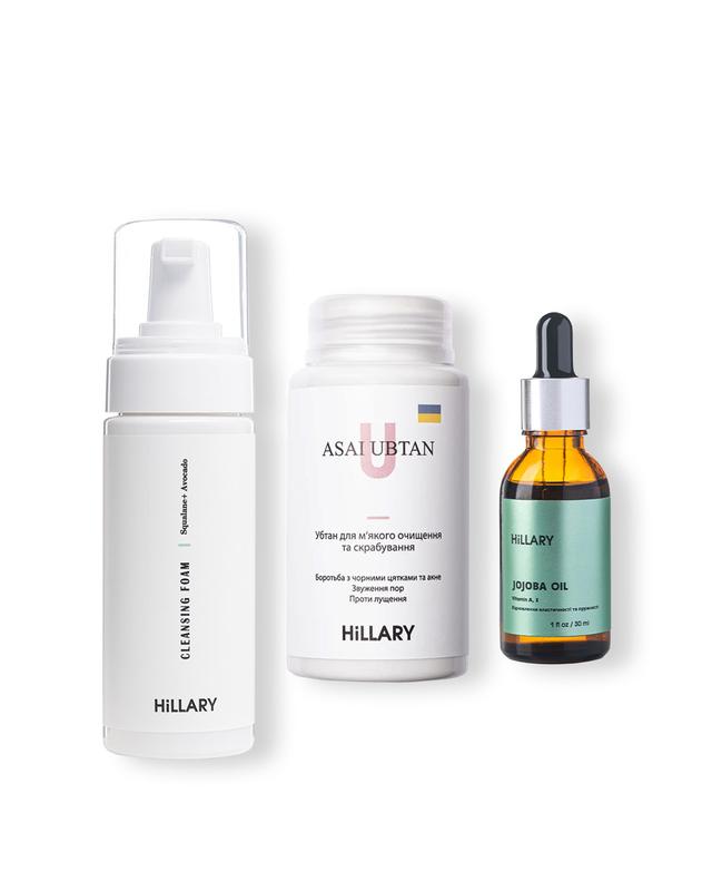 Осінній набір для очищення, глибокого зволоження та відновлення чутливої шкіри обличчя живить та зволожує, забирає чорні цятки, відновлює та заспокоює шкіру, знімає почервоніння та подразнення. Після щоденного застосування, набір зменшить запалення, звузить пори та вирівняє тон, поверне еластичність шкірі та надасть здорового вигляду обличчя. До набору входять: - Натуральна олія для обличчя та волосся Hillary JOJOBA OIL, 30 мл - Очищуюча пінка для сухої та чутливої шкіри Hillary Cleansing Foam Squalane + Avocado oil, 150 мл - Убтан для м'якого очищення і скрабування Hillary ASAI UBTAN, 100 г Спосіб застосування: 1. Невелику кількість пінки нанесіть на вологе обличчя легкими масажним рухами, ретельно промийте обличчя водою. 2. Невелику кількість порошку убтану насипте у долоню, додати трохи води і розвести до пастоподібного стану. Нанести на вологу шкіру, обережно розподілити по всьому обличчю, помасажувати і змити. Можна застосовувати двічі-тричі на тиждень. 3. Олію жожоба нанесіть тонким шаром на шкіру обличчя, шиї й декольте і почекати, поки воно повністю вбереться. Така процедура сприяє усунення мішків під очима, зволоженню шкіри. Якщо ваша шкіра не схильна до закупорювання пор, можете наносити олію поверх нічного крему і залишати на обличчі до ранку.