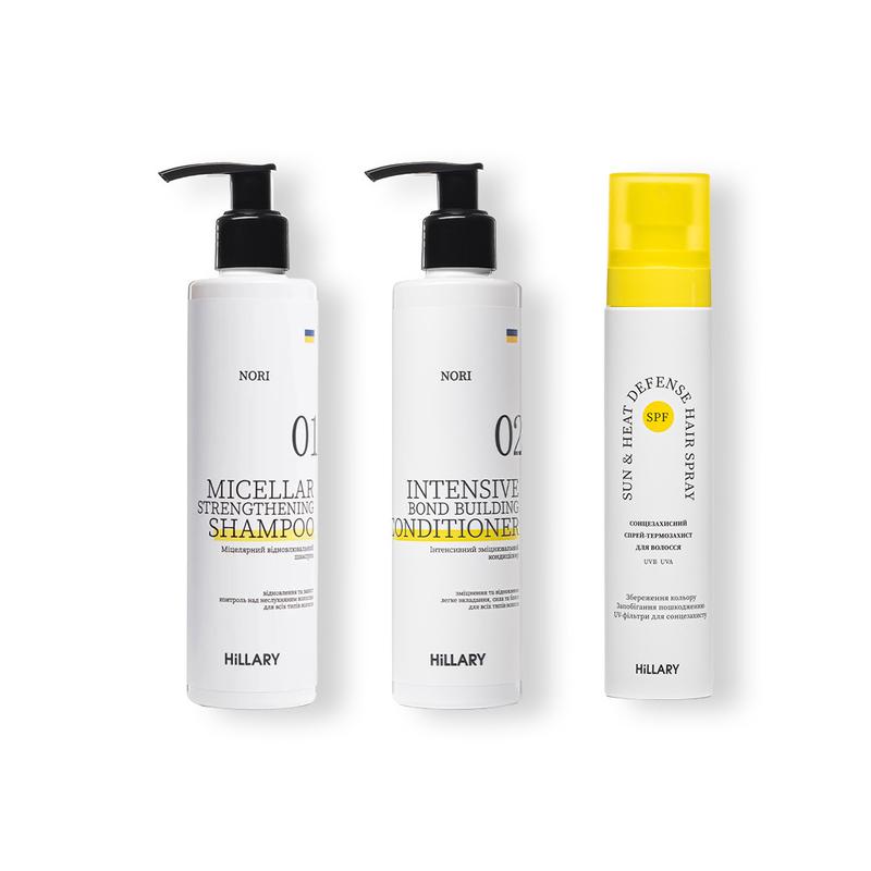 Інноваційний догляд за волоссям з ексклюзивним набором продуктів. Шампунь з міцелярною технологією не лише очищує і живить волосся по всій довжині, але й захищає від негативного впливу навколишнього середовища, підтримуючи гідроліпідний баланс шкіри голови. Додайте до цього кондиціонер, що ніжно доглядає і відновлює дисульфідні зв'язки в кожній волосині, підсилюючи природний завиток у кучерявому волоссі. Полегшує розчісування, запобігає втраті вологи і додає природного сяйва, зміцнюючи волосся по всій довжині. Завершуйте свій ритуал з сонцезахисним спреєм, який надає всебічний захист від сонячних променів і термічного ушкодження. Його комплекс із протеїнів рису та коноплі глибоко проникає, зміцнюючи волосся та захищаючи його від посіченості та тьмяності. Низькомолекулярні УФ-фільтри забезпечують захист меланіну і пігментів від вигоряння, зберігаючи насиченість кольору. Насолоджуйтесь яскравим блиском і довше зберігай свіжість волосся, незалежно від його типу, особливо якщо воно фарбоване чи висвітлене. До набору входять: - Міцелярний відновлювальний шампунь Norі Hillary Nory Micellar Strengthening Shampoo, 250 мл - Інтенсивний зміцнювальний кондиціонер Nori Intensive Nori Bond Building Conditioner, 250 мл - Сонцезахисний спрей-термозахист Hillary Sun&Heat; Defense Hair Spray, 100 мл Спосіб застосування: 1. Нанесіть шампунь масажними рухами на вологе волосся, спіньте, залиште на 1-2 хвилини, потім ретельно змийте теплою водою. Повторіть двічі. Підходить для щоденного застосування. Увага! Уникати контакту з очима. У разі потрапляння в очі негайно промити їх водою. 2. Рівномірно розподіліть кондиціонер на чисте волосся після миття шампунем і залиште на 5-10 хвилин. Змити теплою водою. 3. Для захисту від сонця невелику кількість спрею нанесіть на сухе або злегка вологе волосся по всій довжині, не змивати. У разі тривалого впливу сонця можна наносити кілька разів протягом дня. Для термозахисту рівномірно нанесіть спрей на вологе волосся до початку вкладання феном. Або на сухому волосі перед використанням плойки вирівнювача для волосся.