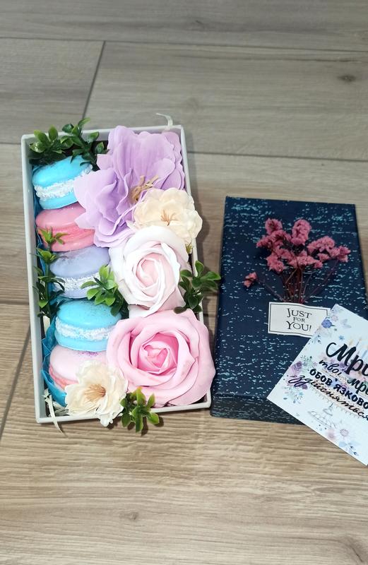 Подарочный бокс. Мыльные цветы. Натуральное мыло макарон ручной работы. По желанию возможно любое наполнение, дополнение, размер.