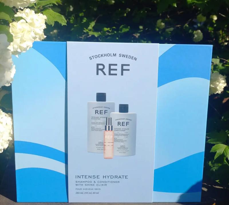 Подарунковий набір для зволоження волосся REF Gift Box Intense Hydrate (шампунь, 285 мл + кондиціонер, 245 мл + еліксир, 80 мл) Дайте сухому волоссю живильну вологу з REF Gift Box Intense Hydrate! Олії кокоса, бергамота, розмарину та камелії у поєднанні з протеїнами кіноа — ваша формула краси. У наборі є шампунь, 285мл. Він не тільки очищає, але також інтенсивно зволожує, розгладжує волосся, зменшує пушіння. Засіб не містить сульфатів. Кондиціонер, 245 мл. Він насичує вологою та живить, зміцнює та відновлює волосся. Еліксир, 80 мл. Він миттєво надає волоссю блиску та гладкості, насичує вологою та зміцнює, полегшує розчісування та укладання. Продукти з набору містять комплекс, який захищає яскравість кольору волосся. Вони мають веганську формулу, не тестувалися на тваринах.