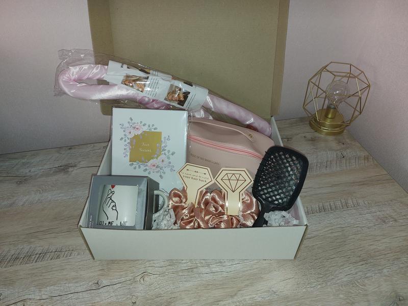 Опис боксу : - набор для завивки волос без нагрева ( 4 ед). - Резинки атласные для волос 2 шт. - косметичка рожева . - кружка подарочная (на выбор) - щетка для волос. ‐ блокнот белый. - подарочная упаковка. Цена 880 грн.