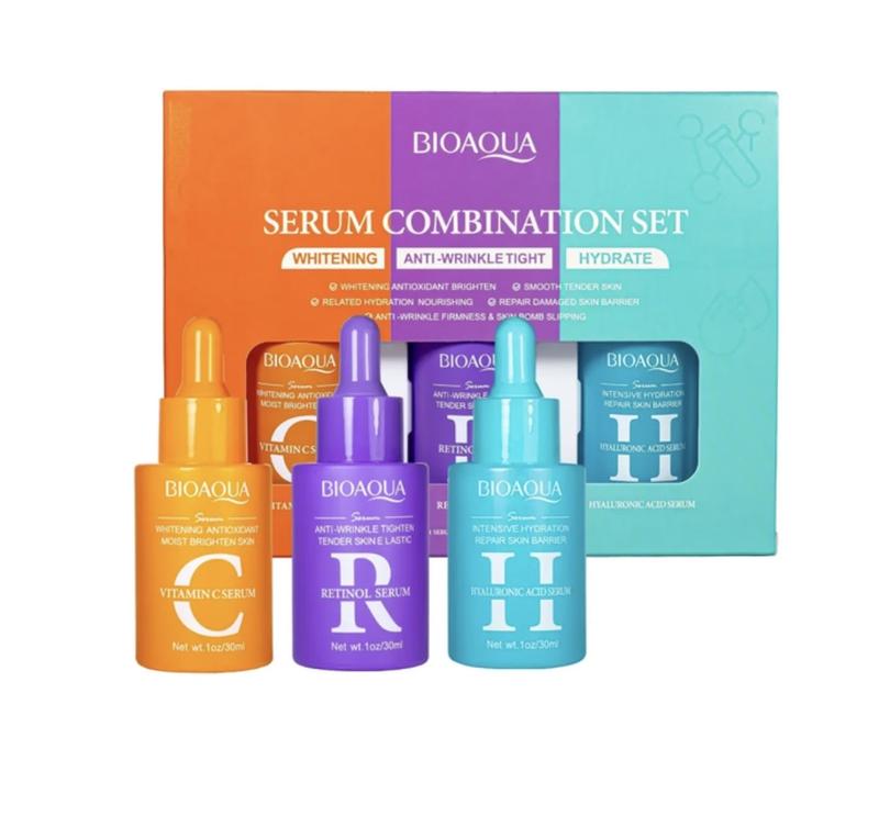 Набір сироваток для обличчя BIOAQUA Serum Combination Set (3*30 мл) — це комплексний догляд, що забезпечує значне покращення стану шкіри. У наборі представлені три сироватки: з гіалуроновою кислотою, вітаміном C та ретинолом. Кожна сироватка об'ємом 30 мл, що дозволяє пройти повний курс зволоження та відновлення шкіри. Властивості: Гіалуронова кислота — ключовий компонент для зволоження, який проникає у глибокі шари шкіри, насичуючи її вологою та запобігаючи появі сухості і дрібних зморшок. Вітамін C — потужний антиоксидант, що бореться з пігментацією, вирівнює тон обличчя та надає шкірі сяяння. Ретинол — сприяє оновленню клітин шкіри, розгладжує зморшки, покращує текстуру та робить шкіру більш пружною. Результат: При регулярному використанні всіх трьох сироваток шкіра стане помітно більш пружною, гладкою та молодою. Зморшки та пігментація зменшаться, а обличчя набуде рівного тону та природного сяяння. Спосіб застосування: Наносіть сироватки вранці та/або ввечері на очищену шкіру. Для максимального ефекту рекомендується використовувати всі три сироватки почергово або комбінувати їх, залежно від поточних потреб шкіри.
