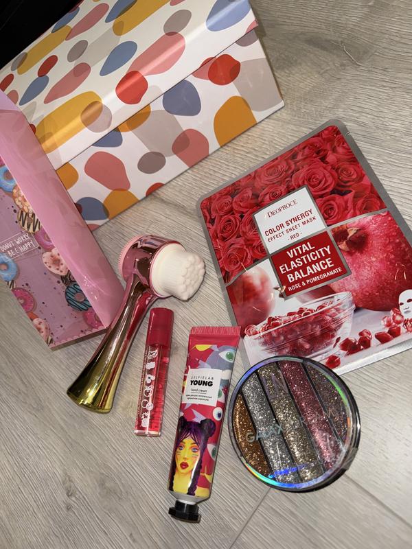 подарочный набор 5в1 щеточка для лица+маска для лица+блеск маселка для губ+крем для рук+шимер для лица и тела