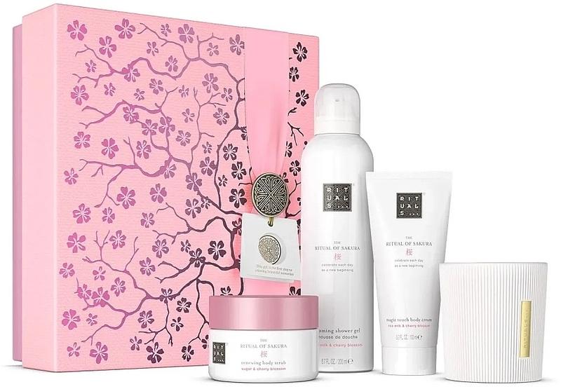 Размер М. Восстанавливающий уход. Производство. Германия Набор включает: -1 Х Пенистый гель для душа The Ritual of Sakura 200 мл, -1 Х Скраб для тела «Ritual of Sakura» 125 г, -1 Х Крем для тела «Ritual of Sakura» 100 мл, -1 Х Ароматическая свеча «Ritual of Sakura» 140г Легкий цветочный аромат, сочетающий в себе мягкие запахи рисового молока для восхитительного сладковато-сливочного аромата.