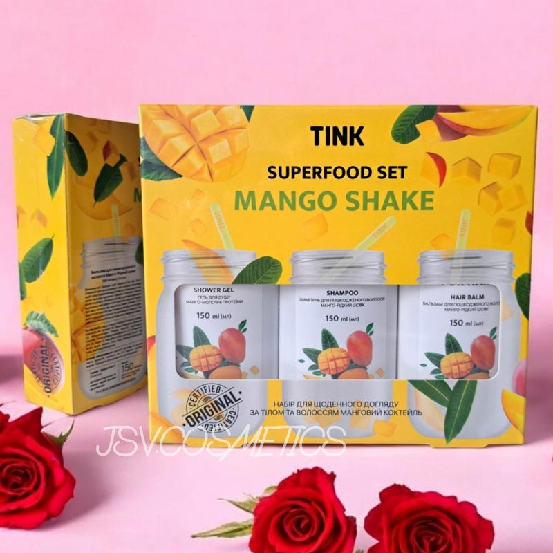Подарунковий набір Superfood Set Mango Shake Tink™ з трьох засобів містить: ✨️Ніжний гель для душу з ароматом манго 150 мл ✨️Шампунь для пошкодженого волосся з рідким шовком 150 мл ✨️Бальзам для пошкодженого волосся з рідким шовком 150 мл Тріо засобів по догляду за тілом та волоссям стануть чудовим подарунком для жінки та проявом турботи Гель для душу серії Superfood for Body Tink™ підходить для щоденного очищення шкіри та догляду за нею. Завдяки активній формулі з екстрактом манго та молочними протеїнами шкіра стає зволоженою, ніжною та пружною. Яскравий аромат допоможе розслабитися та отримати справжнє задоволення від щоденного ритуалу очищення тіла. Відновлюючий шампунь серії Superfood for Hair Tink™ для пошкодженого волосся насичений природними рослинними оліями та екстрактами, які живлять та зволожують локони. Приємний аромат подарує насолоду під час миття голови та залишить легкий ненав'язливий шлейф. Бальзам серії Superfood for Hair Tink™ для пошкодженого волосся дбайливо доглядає і відновлює природний блиск, надає гнучкості, запобігає ламкості і ущільнює структуру волосся.
