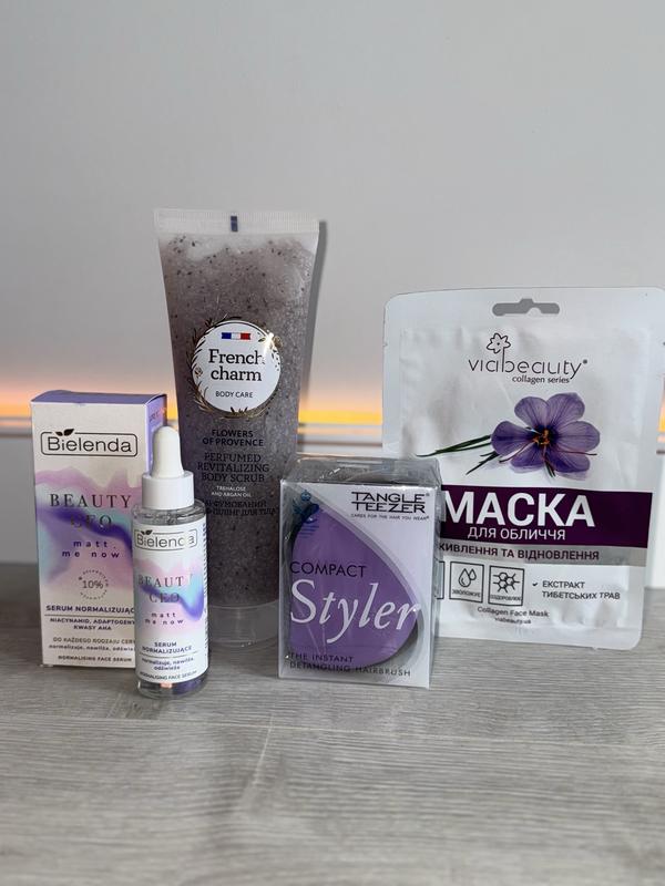 набір подарунковий 4в1💜скраб для тіла+гребінець tangle+сироватка+ маска