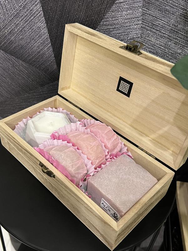 Набір натурального мила "Ароматна скринька" Унікальна дерев'яна скринька, наповнена елітними сортами натурального мила на основі рослинних олій, яке виготовлено традиційним холодним методом з додаванням шовку, колоїдної вівсянки, соку алое, трав, натуральних ефірних та ароматичних олій, що мають чарівні аромати. Родзинка набору ароматна натуральна соєва свічка з розкішним ароматом. Вся ця розкіш знаходиться в дерев'яній скриньці, яка стане в пригоді. Щоб ванна кімната не виглядала нудно, обов'язково зробіть акценти за допомогою гарних форм мила. В наборі 4 натуральних, яскравих шматочків мила та ароматна соєва свічка. 1. Шовкове мило Cashmere- Порівняйте чудовий, вишуканий аромат з Cashmere Mist від Donna Karan. Чуттєвий, з екзотичними пряними нотами. Цей сексуальний аромат має ноти шафрану, ягід піменто, білого перцю та прекрасну суміш квіткових, пачулі та ванілі. 2.Натуральне мило ручної роботи Mountain Fresh Спокуслива і яскрава квітка. Цитрусові ноти бергамоту та олії солодкого апельсина очолюють цей оманливо тонкий аромат із середніми нотами ірису, білої троянди та середземноморського інжиру. М'який пудровий післясмак дерева, мускусу і ветівера завершує цю квіткову суміш, що інтригує. 3.Шовкове мило Bombshell Натуральне шовкове мило ручної роботи з маслом Ши шовком та вівсянкою у складі, м'яко очищає шкіру, не пересушуючи її. Чудовий, вишуканий аромат Bombshell - культовий фруктово-квітковий аромат пахне водоспадом і освіжає у спекотні дні. 4. Шовкове натуральне мило Aloe М'якіть алое на 96% складається з води, що дозволило повністю замінити воду при приготуванні цього мила на алое. 5.Натуральна ароматна соєва свічка в кашпо гексагон. 6.Унікальна дерев'яна скринька.