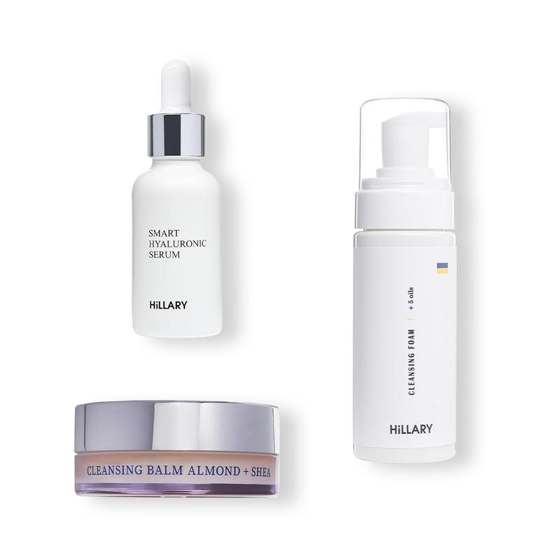 Набір для ефективного та дбайливого видалення макіяжу видаляє макіяж і бруд, не подразнюючи шкіру та не залишаючи на ній неприємної жирної плівки. Бальзам на основі мигдальної олії та ефірів ши має консистенцію, що нагадує чисту олію ши та легко тане на сухій шкірі обличчя, очей і губ. Розчиняє залишки декоративної косметики та очищує пори від надлишків шкірного себуму. При контакті з водою перетворюється на ніжне молочко. Легко змивається, не залишаючи жирної плівки. Очищуюча пінка для нормальної шкіри з 5-ма оліями із сумішшю 5 олій створює речовину, подібну до ліпідного прошарку, що скріплює корнеоцити – клітини, що утворюють ороговілий шар шкіри, не шкодить мікробіому, підсилює ліпідобар’єр та зберігає природний Ph-баланс шкіри, ретельно розчиняє та видаляє навіть найстійкіший макіяж, надає шкірі обличчя приємного відтінку та вирівнює тон. А гіалуронова сироватка зволожує глибокі шари шкіри, попереджає старіння і відроджує молодість шкіри, відновлює і захищає, утримує вологу всередині шкіри, помітно скорочує зморшки, підтягує шкіру і надає їй сяйва. Під час масажу, властивості гіалуронової сироватки значно підсилюються. До набору входять: - Очищуюча пінка для нормальної шкіри Hillary Cleansing Foam + 5 oils, 150 мл; - Гіалуронова сироватка Hillary Smart Hyaluronic, 30 мл; - Очищувальний бальзам для зняття макіяжу для всіх типів шкіри Hillary Cleansing Balm Almond + Shea, 90 мл. Спосіб застосування: 1. Нанесіть очищувальний бальзам пальцями на сухе обличчя, зокрема губи й очі. Злегка помасажуйте, потім додайте трохи води й знову м'яко помасажуйте, щоб олія перетворилася на молочну емульсію. Ретельно змийте водою. 2. Після очищення шкіри бальзамом використовуйте для вмивання невелику кількість очищуючої пінки. Нанесіть її на вологе обличчя легкими масажними рухами, ретельно сполосніть обличчя водою; 3. На очищену шкіру нанесіть кілька крапель гіалуронової сироватки масажними рухами нанести на чисту шкіру обличчя, шиї і зоні декольте. Наносити сироватку можна двічі на день, в тому числі як активний засіб під крем.