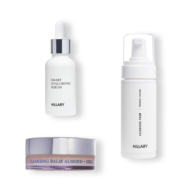 Набір для ефективного та дбайливого видалення макіяжу видаляє макіяж і бруд, не подразнюючи шкіру та не залишаючи на ній неприємної жирної плівки. Бальзам на основі мигдальної олії та ефірів ши має консистенцію, що нагадує чисту олію ши та легко тане на сухій шкірі обличчя, очей і губ. Розчиняє залишки декоративної косметики та очищує пори від надлишків шкірного себуму. При контакті з водою перетворюється на ніжне молочко. Легко змивається, не залишаючи жирної плівки. Очищуюча пінка для сухої та чутливої шкіри зі скваланом та олією авокадо відновлює ліпідний бар'єр та не шкодить мікробіому шкіри, делікатно та м'яко розчиняє та видаляє навіть найстійкіший макіяж, надає шкірі обличчя приємного відтінку та вирівнює тон. А гіалуронова сироватка зволожує глибокі шари шкіри, попереджає старіння і відроджує молодість шкіри, відновлює і захищає, утримує вологу всередині шкіри, помітно скорочує зморшки, підтягує шкіру і надає їй сяйва. Під час масажу, властивості гіалуронової сироватки значно підсилюються. До набору входять: - Очищуюча пінка для сухої та чутливої шкіри Hillary Cleansing Foam Squalane + Avocado oil, 150 мл; - Гіалуронова сироватка Hillary Smart Hyaluronic, 30 мл; - Очищувальний бальзам для зняття макіяжу для всіх типів шкіри Hillary Cleansing Balm Almond + Shea, 90 мл. Спосіб застосування: 1. Нанесіть очищувальний бальзам пальцями на сухе обличчя, зокрема губи й очі. Злегка помасажуйте, потім додайте трохи води й знову м'яко помасажуйте, щоб олія перетворилася на молочну емульсію. Ретельно змийте водою. 2. Після очищення шкіри бальзамом використовуйте для вмивання невелику кількість очищуючої пінки. Нанесіть її на вологе обличчя легкими масажними рухами, ретельно сполосніть обличчя водою; 3. На очищену шкіру нанесіть кілька крапель гіалуронової сироватки масажними рухами нанести на чисту шкіру обличчя, шиї і зоні декольте. Наносити сироватку можна двічі на день, в тому числі як активний засіб під крем.