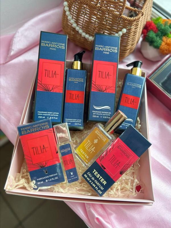 - Tilia Marc-Antoine Barrois набір( гель, лосьйон, парфюми 40мл, парфюми58мл) - це унісекс-аромат, випущений у 2024 році, належить до групи квіткових деревно-мускусних ароматів. - Парфумер - Квентін Біш. - Ноти аромату: липовий цвіт, жасмин самбак, дрок, геліотроп, квітка апельсина, ветивер, а також Ambrofix™ та Georgywood. - Лінія продуктів включає парфумовану воду (Eau de Parfum), лосьйон для тіла (Fragrance Body Lotion) та гель для душу (Fragrance Shower Gel). - Концепція аромату - втілення літа, спокою та щасливих моментів, асоціюється з теплом, квітучими луками та безтурботністю.