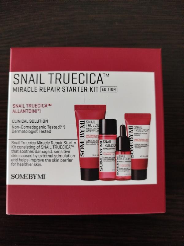 Набор состоит: - Гель для умывания - Some By Mi Snail Truecica Miracle Repair Gel, 30 мл, - Крем для лица - Some By Mi Snail Truecica Miracle Repair Cream, 20 мл - Тоник для лица - Some By Mi Snail Truecica Miracle Repair Toner, 30 мл - Омолаживающая сыворотка - Some By Mi Snail Truecica Miracle Repair Serum, 10 мл