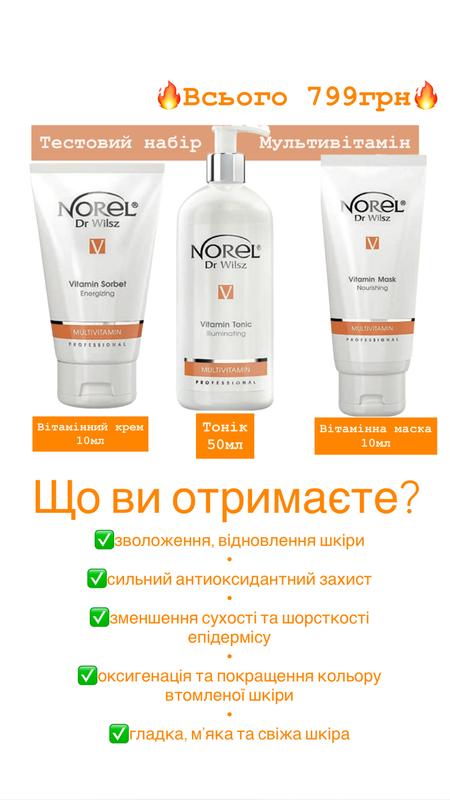Професійний набір засобів Мультивітамін від польського бренду професійної косметики Norel Вітамінний крем — 10 мл Тонік — 50мл Вітамінна маска — 10 мл Що ви отримаєте? • зволоження, відновлення шкіри •сильний антиоксидантний захист •зменшення сухості та шорсткості епідермісу Фоксигенація та покращення кольору втомленої шкіри • гладка, мʼяка та свіжа шкіра АКТИВНІ КОМПОНЕНТИ • комплекс з 8 вітамінів (А, В3, В6, С, Е, F, провітамін В5, коензим Q10), • екстракти лайма і мандарина • масло виноградних кісточок • оливкова олія • олія ши.