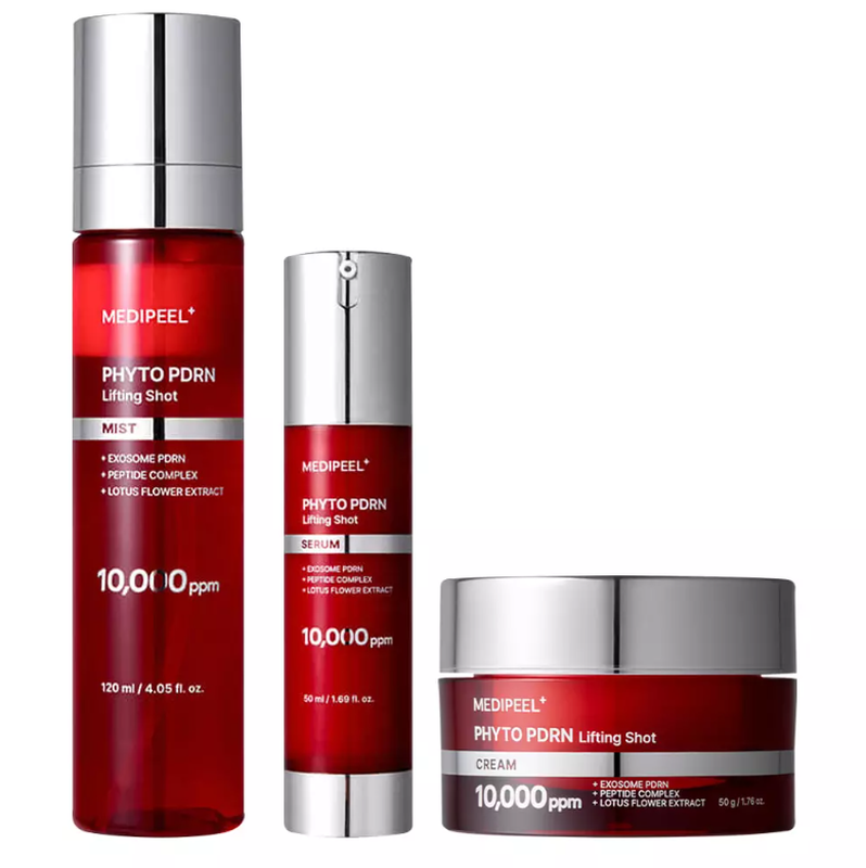 Лифтинг набор Phyto Exosome PDRN от MEDIPEEL+ предназначен для комплексного ухода за кожей, направленного на восстановление упругости, глубокого увлажнения и улучшения текстуры. Продукты из набора работают синергически, обеспечивая видимые результаты уже после нескольких использований. Подходит для всех типов кожи, включая чувствительную, это находка для женщин, которые хотят сохранить молодость и сияющую кожу. Комплексное использование всей линейки продуктов MEDIPEEL+ Phyto Exosome PDRN Lifting Shot показывает впечатляющие результаты: -Глубина мимических морщин на лбу и между бровями уменьшается на 11,22%. -ногубные морщины становятся менее выраженными на 14,16%. -Эти данные подтверждают высокую эффективность серии в борьбе с возрастными изменениями и улучшения общего состояния кожных покровов Входящий в комплект: -Сироватка MEDIPEEL Phyto Exosome PDRN Lifting Shot Serum 50ml Инновационная формула с эктосомами и полинуклеотидами (PDRN) проникает глубоко в слои кожи, стимулируя обновление клеток и улучшая регенерацию клеток. Сыворотка помогает разгладить морщинки, уменьшает признаки усталости и укрепляет кожный барьер. -Крем MEDIPEEL Phyto Exosome PDRN Lifting Shot Cream 50g имеет насыщенную текстуру и сочетает в себе интенсивное питание и глубокое увлажнение. Экзосомы в составе способствуют синтезу коллагена, делая кожу более упругой и гладкой. Идеально подходит для использования как утром, так и вечером. -MEDIPEEL Phyto Exosome PDRN Lifting Shot Mist 120ml быстро восстанавливает гидробаланс кожи, наполняя ее влагой и питательными веществами. Мист не только освежает, но и усиливает действие сыворотки и крема, закрепляя их действие на весь день. Почему стоит выбрать этот набор: -Комплексное действие: три продукта дополняют друг друга, обеспечивая видимый лифтинг-эффект и улучшение тонуса кожи. -Инновационные технологии: формулы на основе экзосом и полинуклеотидов помогают замедлить процессы старения и вернуть коже естественное сияние. -Универсальный: подходит для всех возрастов и типа кожи, включая кожу с признаками старения. -Экономия времени: набор заменяет сразу несколько этапов ухода, обеспечивая максимальную эффективность. -Подарите своей коже профессиональный уход вместе с Lifting Set MEDIPEEL Phyto Exosome PDRN – идеальное решение для тех, кто ценит качество и эффективность! Какие проблемы решает: -Втрата упругости кожи. -Глубокие и мимические морщины. -Обезводление и сухость кожных покровов. -Тьменный и неровный цвет лица. - Нарушения защитного барьера. -Ознаки усталости и стресса на коже. -Зажиг и покраснения. - Замедление процессов регенерации клеток. Включает в себя: -Фитоэкзосомы: микрочастицы, которые доставляют активные ингредиенты к глубоким слоям кожи, способствуя регенерации клеток, укрепляя и улучшая текстуру кожи. -Vegan Lotus Leaf PDRN: полидезоксирибонуклеотид растительного происхождения, который ускоряет процессы восстановления и омоложения кожи. -Гиалуроновая кислота: интенсивно увлажняет кожу, удерживая влагу и предотвращая обезвоживание. -Керамиды: укрепляют кожный барьер, защищая от внешних факторов и удерживая влагу. -Масло ши: питает и смягчает кожу, делая ее более гладкой и шелковистой. -Ниацинамид: осветляет пигментацию, выравнивает тон кожи и придает ей здоровое сияние. -Пептидные комплексы: стимулируют выработку коллагена, разглаживая морщины и улучшая эластичность кожи. -Экстракт центеллы азиатской: успок