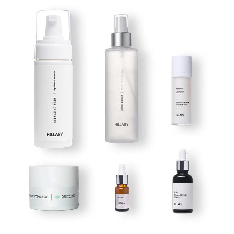 Спеціально для власниць сухої, зневодненої, схильної до лущення шкіри ми підготували сезонний набір для живлення і захисту сухої шкіри Dry Skin Nutrition & Protection. Основою складу засобу є природні компоненти, які забезпечують максимально м'яку, але водночас ефективну дію. До набору входять: - Тонік для сухої та чутливої шкіри Hillary Aloe Toner, 200 мл; - Очищуюча пінка для сухої та чутливої шкіри Hillary Cleansing Foam Squalane + Avocado oil, 150 мл; - Регенеруюча сироватка з біо-ретинолом та скваланом Hillary Bakuchiol & Olive Squalane Skin Renewal Serum, 30 мл; - Гіалуронова зволожуюча сироватка Hillary Pure Hyaluronic, 30 мл; - Експрес сироватка навколо очей Hillary Express Eye Serum, 10 г; - Крем для сухої та чутливої шкіри Hillary Corneotherapy Intense Сare Avocado & Squalane, 50 мл. Спосіб застосування: 1. Невелику кількість пінки нанесіть на вологе обличчя легкими масажним рухами, ретельно промийте обличчя водою. 2. Наступний етап - тонік. Нанесіть невелику кількість тоніку на попередньо очищену шкіру. Уникайте потрапляння в очі. 3. Невелику кількість сироватки express нанесіть кінчиками пальців на добре очищену шкіру навколо очей. 4. Змішайте по кілька крапель сироватки бакучіол та гіалуронову сироватку pure та нанесіть на очищену шкіру тонким шаром, дати увібратися 10-15 хвилин. 5. За необхідності невелику кількість крему нанесіть масажними рухами на попередньо очищену шкіру обличчя, втираючи до повного всмоктування.