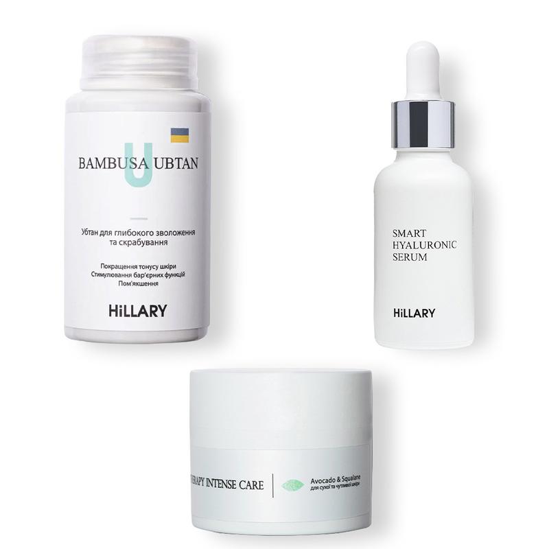 Подарунковий набір з трьох топових продуктів Hillary! Крем Corneotherapy Intense Сare Avocado & Squalane сухої і чутливої шкіри відновлює ліпідний бар'єр і водний баланс шкіри, забезпечує глибоке зволоження і підсилює захисну функцію шкіри від негативних факторів протягом усього дня. Убтан для глибокого зволоження та скрабування Hillary BAMBUSA UBTAN розроблений з урахуванням всіх потреб сухої та чутливої шкіри. Убтан ефективно очищає епідерміс, при цьому не пересушує його, даруючи відчуття чистоти та свіжості. Поживні речовини насичують клітини, даруючи їм пружність і тонус. Після використання HILARY BAMBUSA UBTAN обличчя стає більш свіжим та зволоженим. Сироватка HILLARY SMART HYALURONIC зволожує глибокі шари шкіри, діє як протизапальний агент, попереджає старіння і відроджує молодість шкіри, відновлює і захищає, утримує вологу всередині шкіри, помітно скорочує зморшки, підтягує шкіру і надає їй сяйва та зміцнює природний захисний бар'єр. До набору входять: - Крем для сухої та чутливої шкіри Hillary Corneotherapy Intense Сare Avocado & Squalane, 50 мл; - Убтан для глибокого зволоження та скрабування Hillary BAMBUSA UBTAN, 100 г; - Гіалуронова сироватка Hillary Smart Hyaluronic, 30 мл. Спосіб застосування: 1. Невелику кількість порошку убтану насипте на руку, додати трохи води та розвести до пастоподібного стану. Нанести на зволожене обличчя, обережно розподілити по всьому обличчю, помасажувати та змити. Можна застосовувати два-три рази на тиждень. 2. Нанесіть масажними рухами невелику кількість гіалуронової сироватки на чисту, вологу шкіру обличчя, шию і зону декольте. Використовуйте щодня, вранці (в тому числі і як активний засіб під денний крем) і ввечері. 3. Невелику кількість крему нанесіть масажними рухами на попередньо очищену шкіру обличчя, втираючи до повного всмоктування.