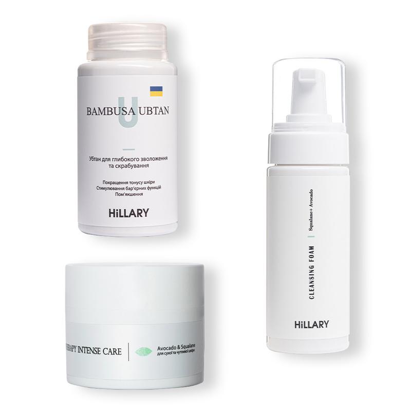Базовий набір "Basic 3" для догляду за сухим типом шкіри, дбайливо очистить та зволожить шкіру завдяки органічним засобам, що входять до набору. Очищуюча пінка для сухої та чутливої шкіри зі скваланом та олією авокадо відновлює ліпідний бар'єр та не шкодить мікробіому шкіри, делікатно та м'яко розчиняє та видаляє навіть найстійкіший макіяж, надає шкірі обличчя приємного відтінку та вирівнює тон. Убтан для глибокого зволоження та скрабування Hillary BAMBUSA UBTAN розроблений з урахуванням всіх потреб сухої та чутливої шкіри. Убтан ефективно очищає епідерміс, при цьому не пересушує його, даруючи відчуття чистоти та свіжості. Поживні речовини насичують клітини, даруючи їм пружність і тонус. Крем Corneotherapy Intense Сare Avocado & Squalane сухої і чутливої шкіри відновлює ліпідний бар'єр і водний баланс шкіри, забезпечує глибоке зволоження і підсилює захисну функцію шкіри від негативних факторів протягом усього дня. До набору входять: - Убтан для глибокого зволоження та скрабування Hillary BAMBUSA UBTAN, 100 г; - Очищуюча пінка для сухої та чутливої шкіри Hillary Cleansing Foam Squalane + Avocado oil, 150 мл. - Крем для сухої та чутливої шкіри Hillary Corneotherapy Intense Сare Avocado & Squalane, 50 м. Спосіб застосування: 1. Невелику кількість пінки нанесіть на вологе обличчя легкими масажним рухами, ретельно промийте обличчя водою. 2. Невелику кількість порошку убтану насипте у долоню, додайте трохи води і розведіть до пастоподібного стану. Нанесіть на вологу шкіру, обережно розподіліть по всьому обличчю, помасажуйте і змийте. Можна застосовувати двічі-тричі на тиждень. 3. Невелику кількість крему нанесіть масажними рухами на шкіру обличчя, втираючи до повного всмоктування.