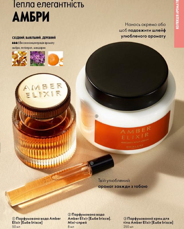 В наборе Парфюмированная вода Amber Elixir 50 мл / 2027 г Парфюмированная вода Amber Elixir 8 мл/12.2025 г Парфюмированный крем для тела Amber Elixir 250 мл/2027 г