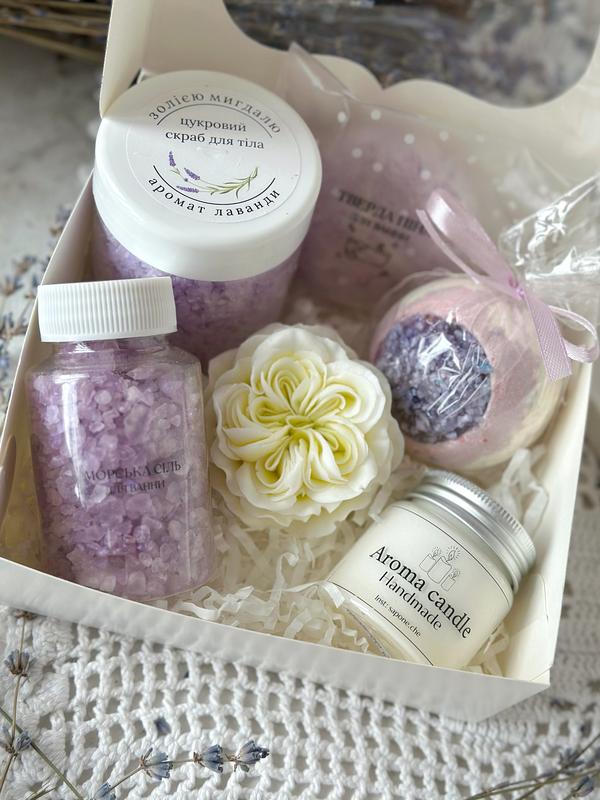 Подарунковий набір ручної роботи. Підійде в якості подарунка з будь якого приводу. Складається: Ароматична свічка ручної роботи з соєвого воску в баночці ( обʼєм 50 мл) Мило ручної роботи у вигляді троянди (65 грм) Пляшечка морської солі для ванни щ ефірною олією ромашки ( 130 грм) Баночки цукрового скрабу для тіла з олією миндалю обʼєм 150 мл Бомбочки для ванни з білою глиною і морською сіллю Твердої пінки для ванни ручної роботи на натуральних ПАВ . Пакування в коробку 15*15*6 см .