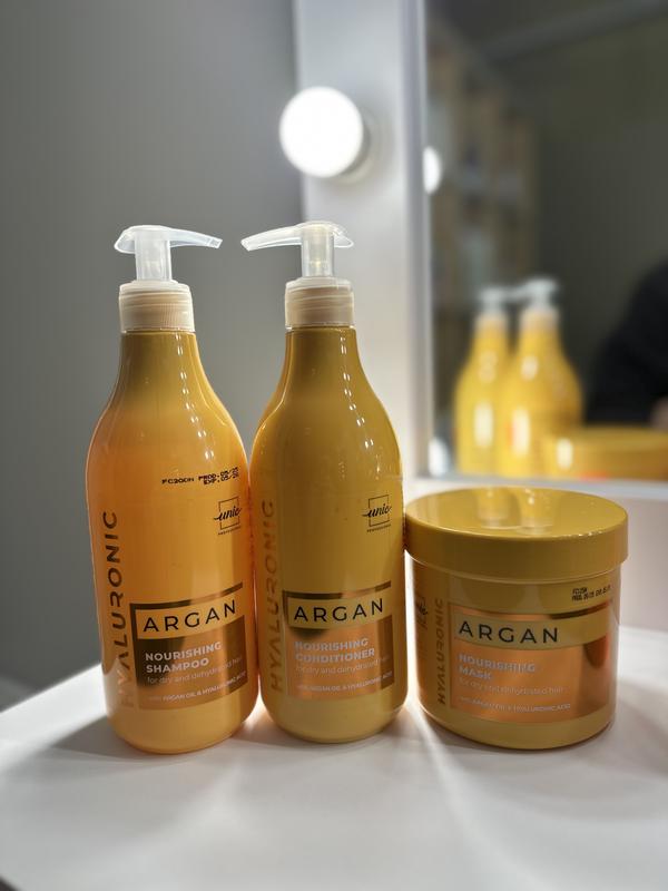 ДОГЛЯД ЗА СУХИМ І ЗАВЕДЕНИМ ВОЛОССЯ ГІАЛУРОНОВИЙ АРГАН ▫️ Містить в складі арганову олію і гіалуронову кислоту ▫️Продукти роблять волосся наповненим, еластичним, шовковистим і блискучим. ▫️Свіжий аргановий аромат Шампунь 410 Кондиціонер 420 грн Маска 470 грн Акційна вартість набору 999 грн