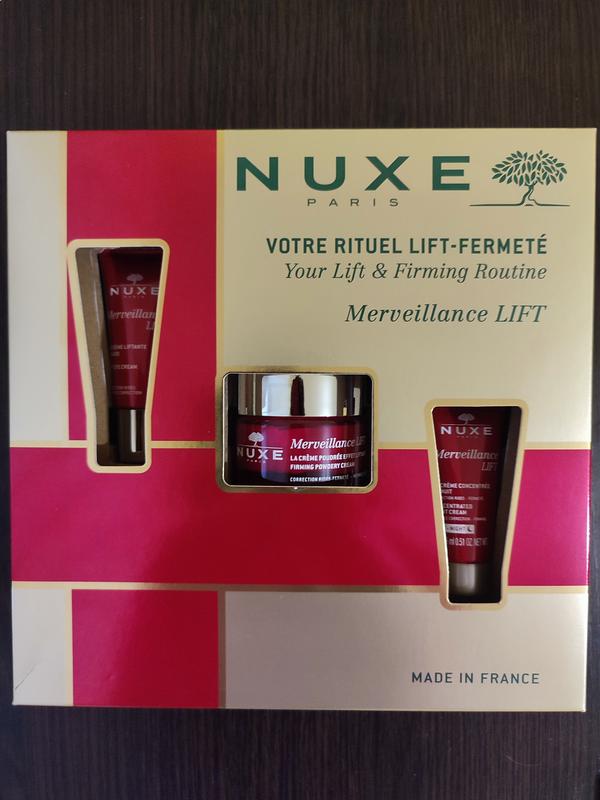Одна из эксклюзивных предложений Nuxe к рождественским праздникам – Merveillance Lift Set. Особый, антивозрастной набор сочетает в себе омолаживающую эффективность и непревзойденное удовольствие. В состав входят средства для уникальной процедуры ухода за зрелой кожей, коррекции морщин. Пудровый крем укрепляющий Nuxe Merveillance Lift Cream Powder Lifting Effect - 96 % ингредиентов натурального происхождения; - идеально подходит для нормальной и комбинированной кожи; - создает мгновенный лифтинг-эффект за счет инновационной консистенции, наполняющей; - содержит ультракорректирующее масло микроводорослей, которое концентрирует омолаживающую силу 4 миллиардов естественных клеток в одной капли для ежедневного разглаживания и укрепления; - превращает рутину в удовольствие от нежной цветочно-мускусной гармонии с нотами фрезии, магнолии и белого мускуса. Укрепляющий концентрированный ночной крем Nuxe Merveillance Lift Concentrated Night Cream - для кожи лица, шеи и зоны декольте; - легко распределяется и быстро впитывается; - оставляет нежный цветочно-мускусный аромат; - содержит 97% натуральных ингредиентов; - обогащен маслом микроводорослей и ее исключительными восстанавливающими свойствами; - помогает коже утром быть свежей и отдохнувшей; - заметно разглаживает морщины и повышает упругость. Лифтинг крем для кожи вокруг глаз Nuxe Merveillance Lift Lift Eye Cream - 97% ингредиентов натурального происхождения; - с уникальной консистенцией и с эффектом размытия – мгновенно делает морщины менее заметными, устраняет следы усталости; - с неповторимым ароматом для наслаждения моментом; - с маслом микроводорослей для ежедневной коррекции признаков старения; - со специальным биомиметическим пептидом, известным своими противоотечными свойствами. Возраст: 35+ Бренд: Nuxe Серия: merveillance Группа товара: набор Назначение: антивозрастное, от морщин, от темных кругов, питания, укрепления, лифтинг, разглаживание Состав набора: крем для лица, крем для век Ингредиенты: алтея, водоросли, глицерин, макадамия, морские водоросли, семена подсолнечника, пептиды, розмарин, сквалан Время применения: дневной, ночной Пол: для женщин Классификация: натуральная Тип кожи: все типы Страна ТМ: Франция Сделано в: Франция