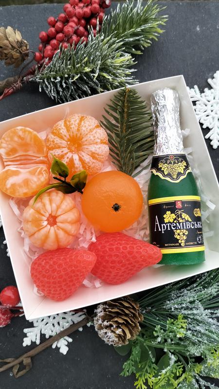 Подарочный набор новогодний из мыла, фрукты ручная работа | мандаринки, клубника, шампанск...